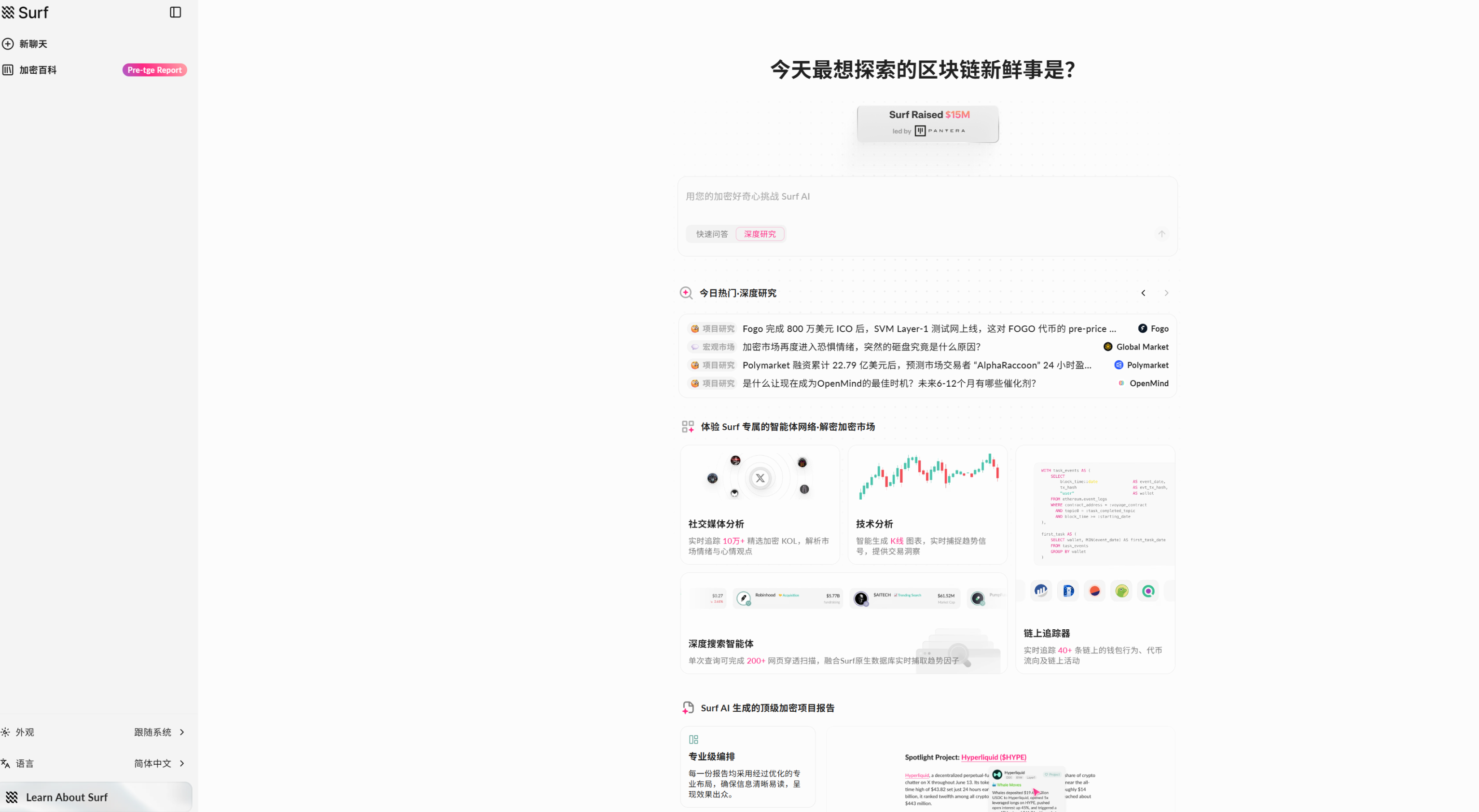 加密领域融资大幅减少的当下,仍有部分项目受到风投青睐。12 月 10 日,Surf 已经成功融资 1500 万美元,本轮融资由 Pantera Capital 领投,Coinbase Ventures 和 DCG 跟投。Surf 定位为专为加密货币设计的 AI 情报平台,究竟有哪些过人之处?