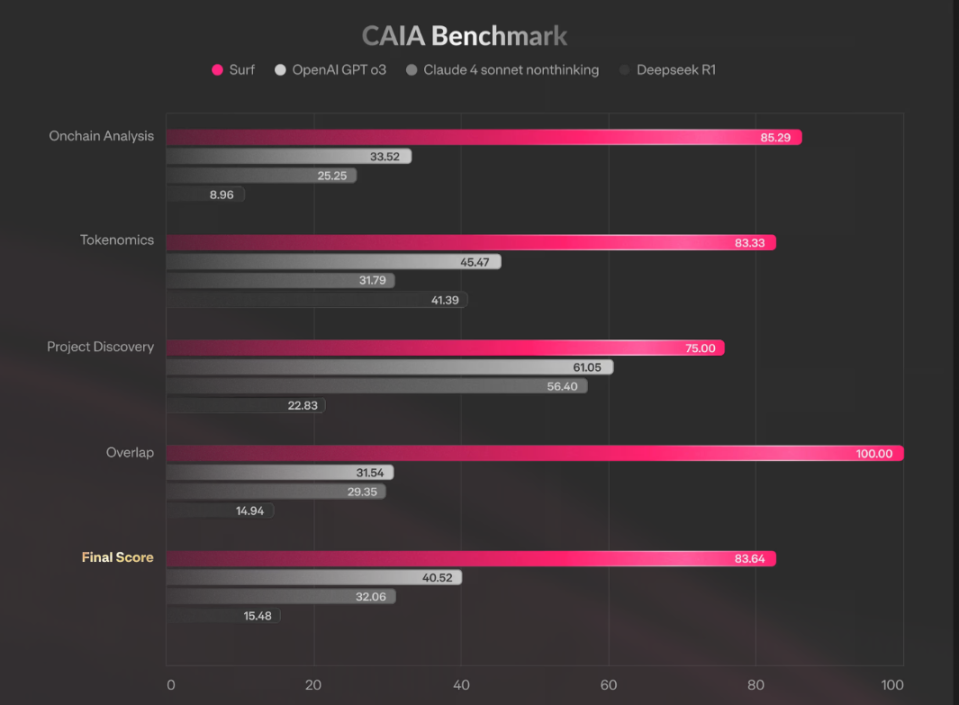 性能上,Surf 1.0 版本在 CAIA 基准测试中脱颖而出。这一基准由 Surf 与普林斯顿大学合作开发,评估 AI 模型执行初级人类分析师任务的能力。结果显示,Surf 在加密特定任务上比 ChatGPT 和 Grok 等模型优秀 4 倍,提供更多具体引用和更少的错误。