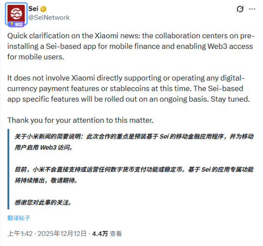 更正:12 月 12 日,根据 Sei 官方的最新澄清,此次合作并不涉及小米直接支持或运营任何数字货币支付或稳定币业务。双方的合作重点在于:在小米手机中预装基于 Sei 的移动金融应用,为用户提供低门槛的 Web3 访问通道。