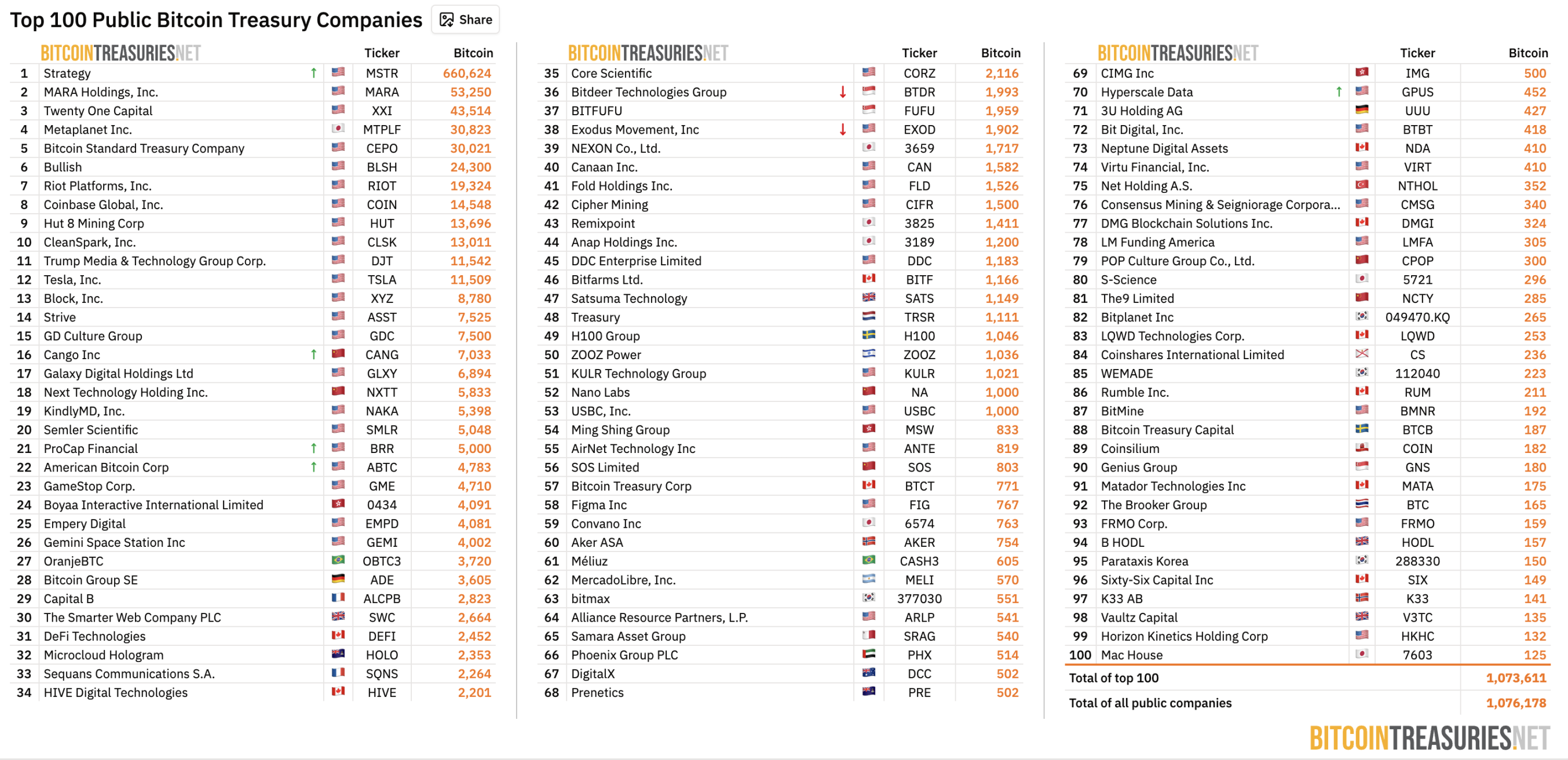 Strategy 并非孤军奋战。据 BitcoinTreasuries.NET 数据统计,截至 12 月 11 日,全球 208 家上市公司持有超 107 万枚比特币,超过比特币总供应量的 5%,当前价值约 1000 亿美元。