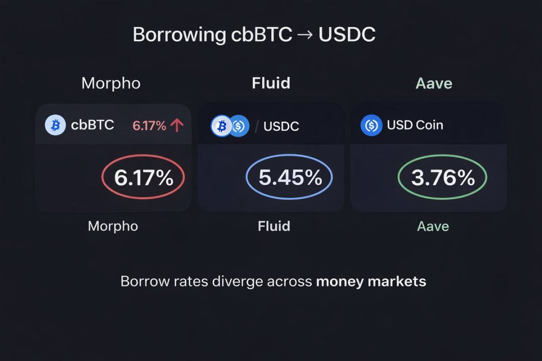 Coinbase 的案例恰好印证了这一点:用户可将其平台上的比特币(cbBTC)作为抵押借入 USDC,而这笔交易流量会被导向 Base 链上的 Morpho 借贷市场。尽管 Base 链上的 Aave 与 Fluid 平台,针对 cbBTC 抵押借入稳定币的业务提供了明显更优的利率,但 Morpho 仍占据市场主导地位。原因很简单,Coinbase 用户愿意为 「眼前可见的便捷操作」 支付额外成本。