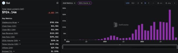 2025 年 10 月,Sui 的 DEX 月交易量一度飙升至近 240 亿美元,证明了其处理大规模、高活跃度交易的能力。11 月的 102 亿美元虽然有所回落,但仍代表了绝大多数公链难以企及的持续性高交易量水平。