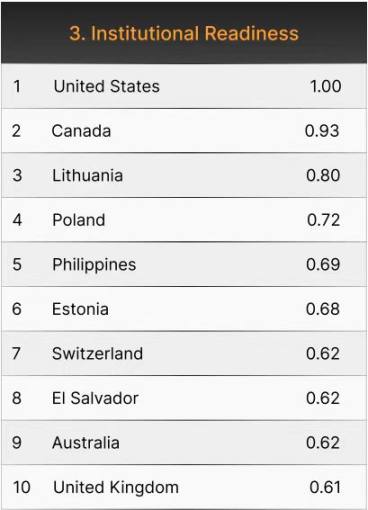 报告显示,美国在“机构就绪度”维度获得满分(1.00),并在监管清晰度、ETF 数量、机构持币规模及基础设施完备度等指标上全面领先。