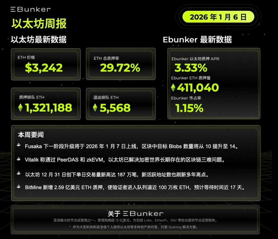 🔘 Fusaka 下一阶段升级将于 2026 年 1 月 7 日上线,区块中目标 Blobs 数量将从 10 提升至 14。