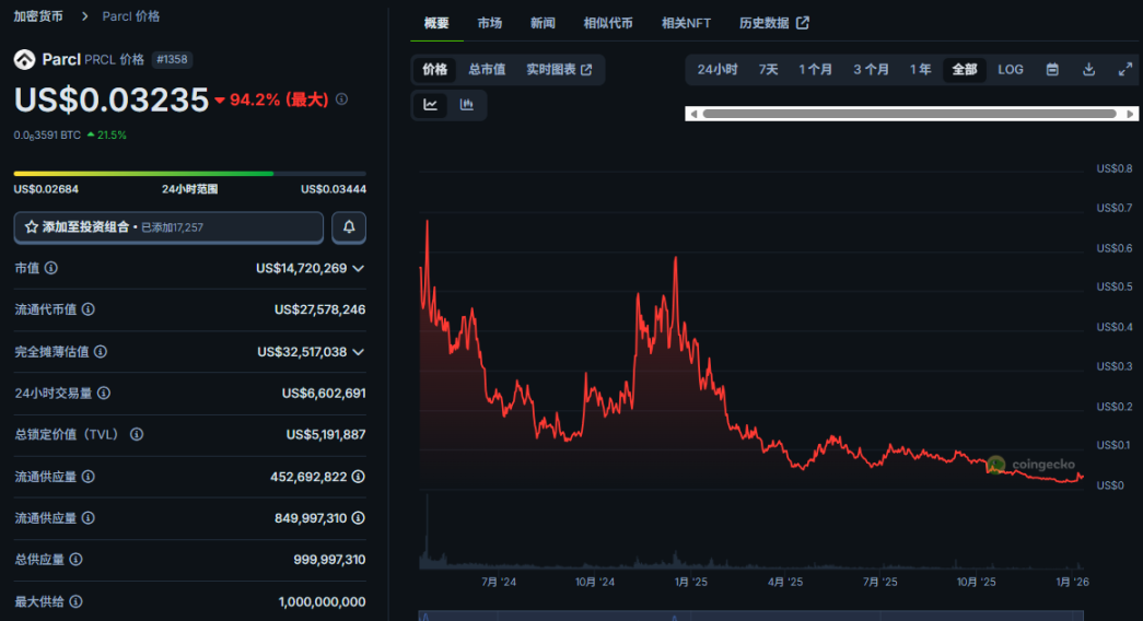 长期以来,Parcl 的代币表现也与其叙事严重脱节,PRCL 币价在 2025 年底跌破 0.02 美元,较 2024 年 4 月高点 0.737 下跌约 97.6%。