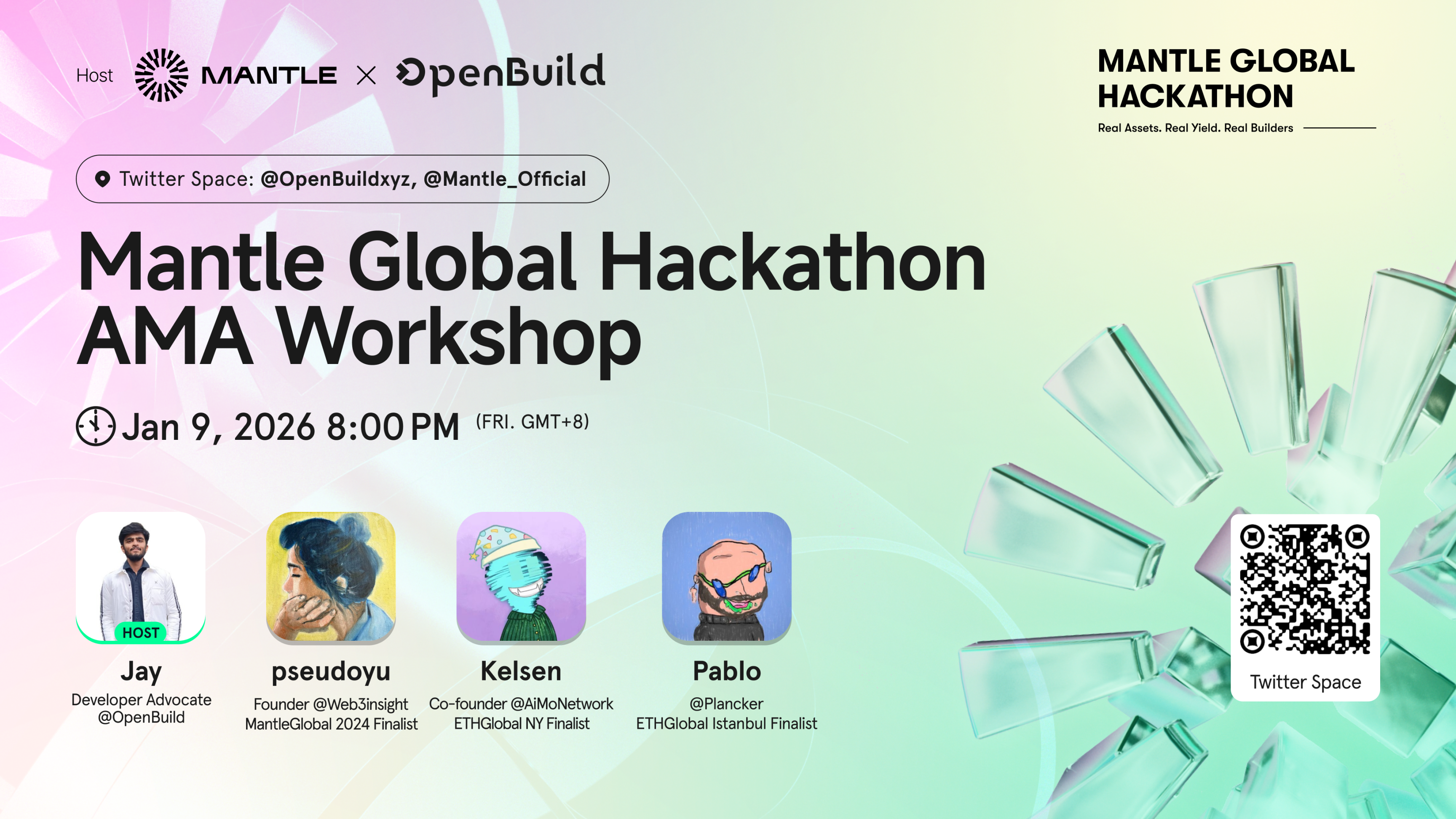 为助力每一位 Builder,OpenBuild 将联合 Mantle 官方,于 1 月 9 日(周五)晚 8 点(GMT+8) 在 Twitter Space 举办首场专题 WorkShop:Hackathon Experience Sharing。