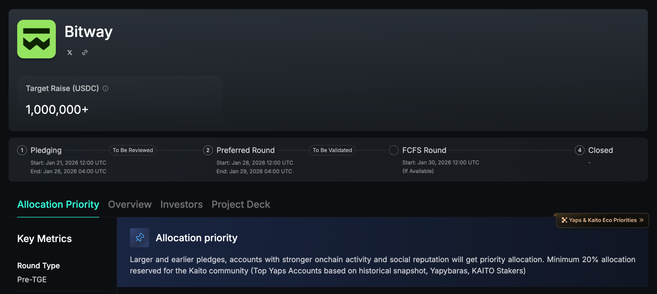 自称为互联网资本门户的 Bitway 继 2025 年 12 月上线币安 Pre-TGE 和 Booster 活动后,又将于北京时间 1 月 21 日 20:00 在 Kaito Capital Launchpad 进行新一轮融资。