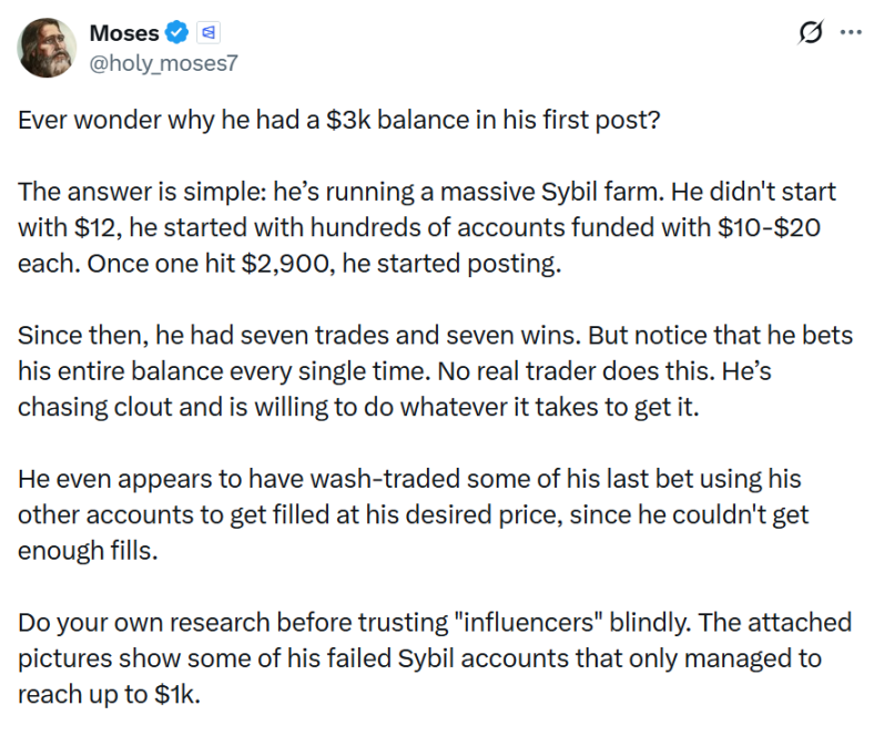 Moses 质疑:「为什么他的第一篇帖子就有 3k 余额?答案很简单:他在运营一个大规模的女巫账号。他不是从 12 美元起步的,而是同时养了几百个账号,每个账号里都先充了 10–20 美元不等。等到其中一个账号涨到 2900 美元,他就立刻开始发帖了。从那之后,他一共做了 7 笔交易,全部都赢了。但注意看,他每一次都是把全部余额 all in。没有哪个真正的交易者会这么玩。