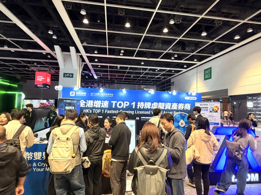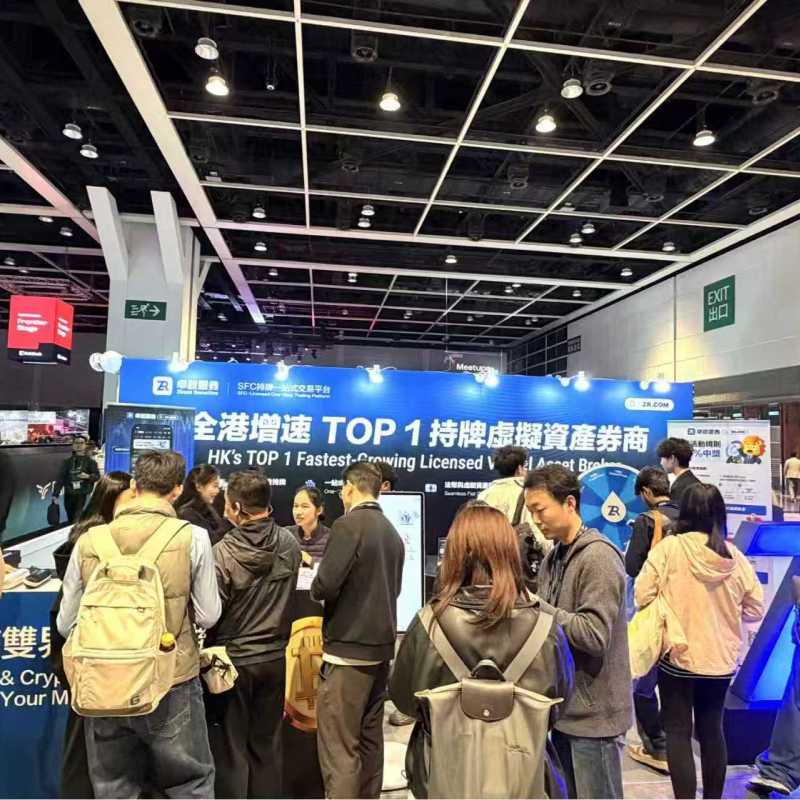 卓锐证券展台整体采用了半包式结构,呈现出了稳定、安全、专业的行业形象。主视觉醒目呈现“全港增速 TOP1 的持牌虚拟资产券商”蓝底标识,彰显了卓锐证券在行业内的领先地位与合规实力。旁侧电子屏幕实时呈现着其自主研发的一站式数字金融服务平台「ZR」的动态信息,配合巨型发光 logo,营造出了未来金融交易的科技氛围,亦象征着传统金融市场与数字资产世界的无缝连接。