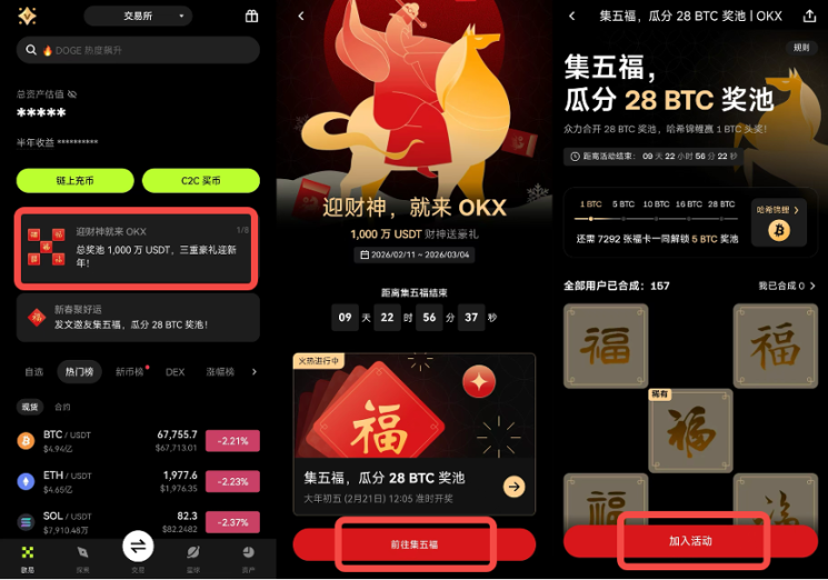 OKX 始终愿意为用户提供有价值的工具和产品,更愿意在每一个重要节点,与您并肩前行。这个春节,我们准备了丰富的活动与福利,希望在新年的第一站,为您送上一份实实在在的好运与祝福。无论您是刚了解 OKX,还是一路相伴的老朋友,都欢迎参与这场春节盛会。让「财神福」陪您开启新一年的第一步。