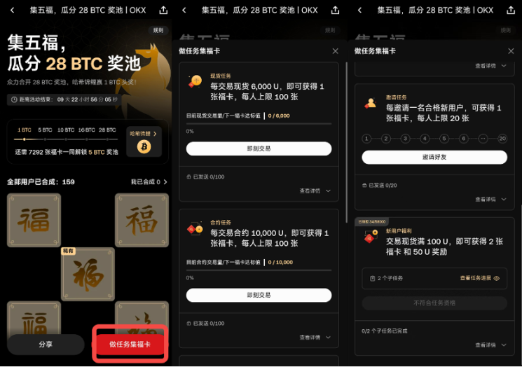 今年 OKX 安排上了币圈的「集五福」活动,跟着 OKX 一起集齐五福福卡,合成「财神福」解锁 28 个 BTC 的超大奖池!
