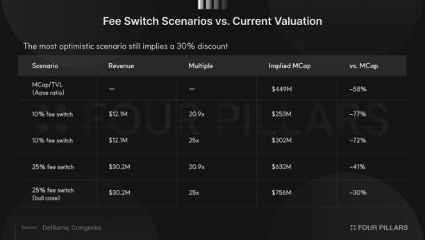 分析费用开关的量化影响:Morpho Blue 智能合约中包含治理可调的费用参数,最高可收取存款人利息的 25%。若启动 10% 的费用开关,每年可产生 1210 万美元协议收入。借贷协议通常以协议收入的 20-25 倍估值交易。按 Aave 当前的 20.9 倍计算,隐含市值为 2.53 亿美元;按 25 倍计算,也仅为 3.02 亿美元,较当前市值低 72%-77%。