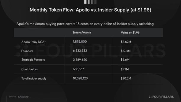假设 Apollo 以最快速度在 48 个月内执行全部 9000 万枚购买,每月购买量为 187.5 万枚(按 1.96 美元计价值 367 万美元)。同期每月解锁的内部人士供应量按相同价格计算为 2020 万美元。即使以最快速度、即使假设通过公开市场而非私下交易,Apollo 也只能覆盖内部人士每 1 美元供应中的约 18 美分。合作协议在创始人解锁代币的同时提供了叙事层面的掩护。